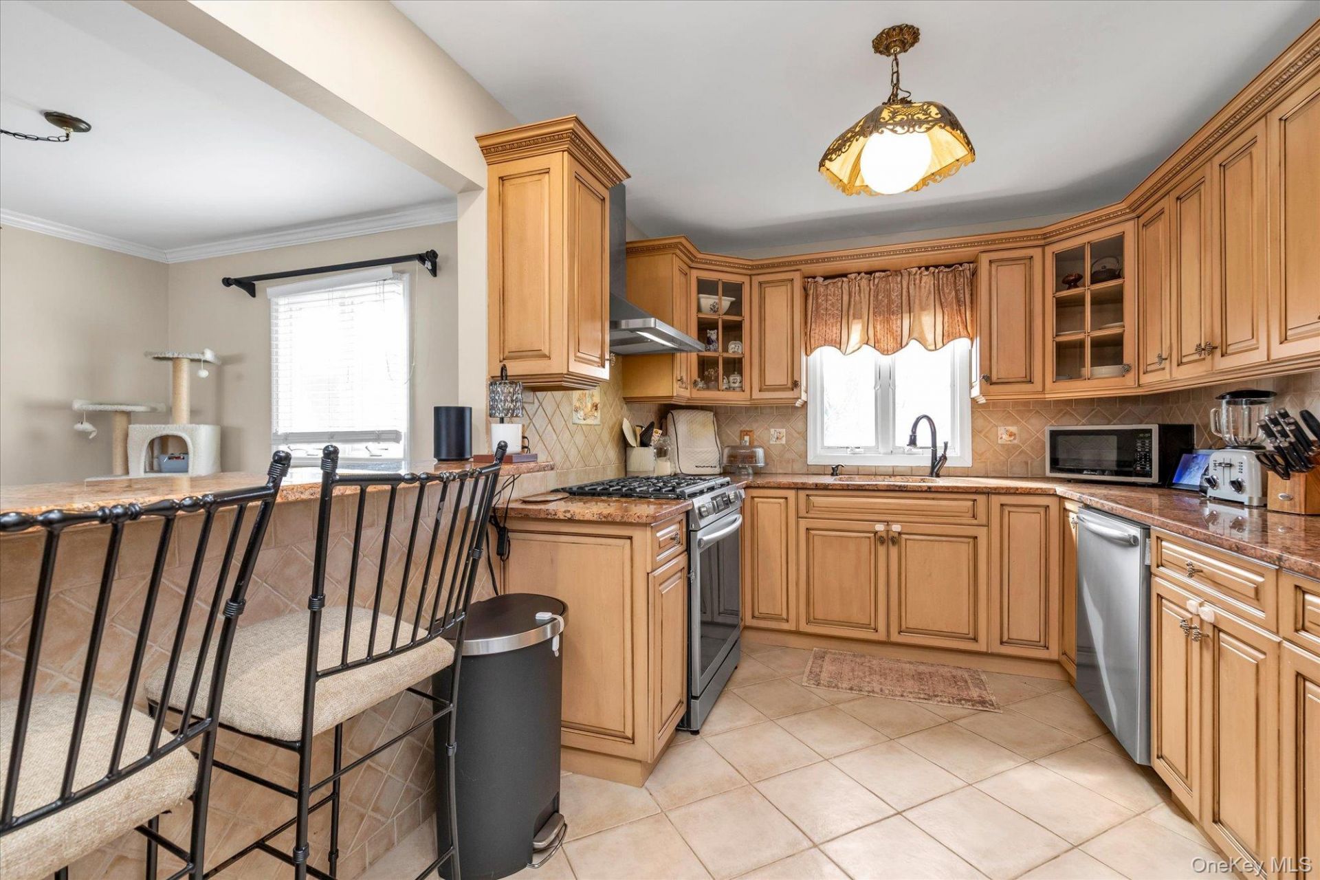 Beautifully Maintained High Ranch on a Quiet Dead-End Street! This spacious home features a sun-filled living room, formal dining room, and an eat-in kitchen with granite countertops and stainless steel appliances. Offering 5 bedrooms and 2 full bathrooms, the home also boasts hardwood floors throughout and elegant moldings. The lower level includes a generous family room with sliders leading to a beautifully fenced backyard-perfect for entertaining-with an above-ground pool and plenty of outdoor space. Additional features include gas heating, a garage, and ample storage. Located in desirable School District #20 and close to transportation, shopping, and more. Potential mother/daughter setup with proper permits.